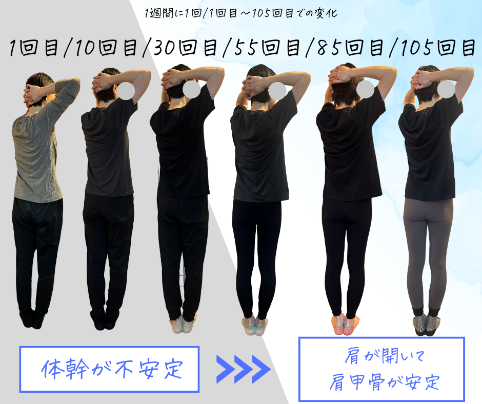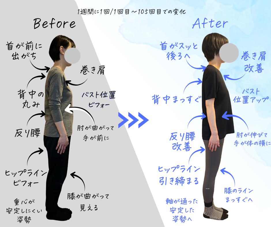 ピラティスの変化は、いきなり別人になるのではなく、回数を重ねるごとに少しずつ整い、その積み重ねが、ある日、写真や日常に表れてきます。