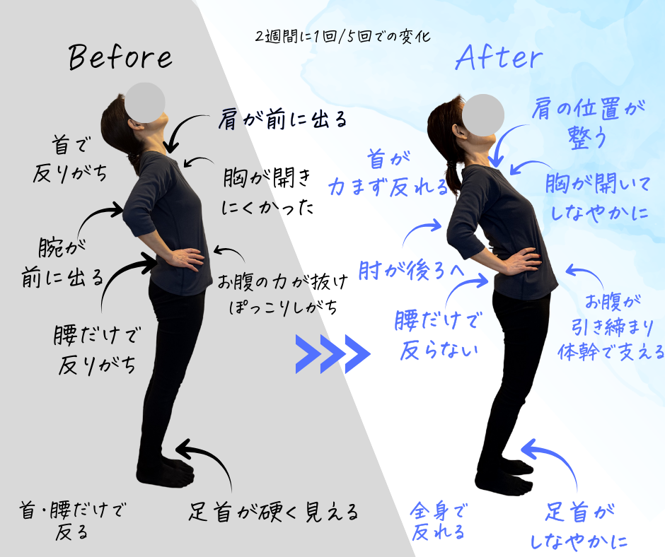 ヨガの太陽礼拝の後屈も、以前よりスムーズにできるようになったそうです。