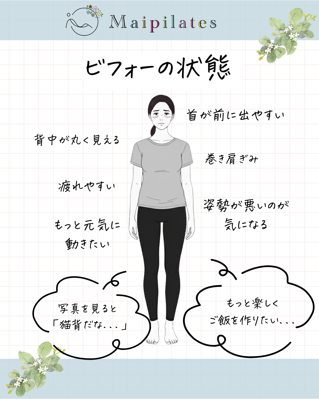 疲れやすく、気づくと姿勢が崩れていて、肩や腰はいつもどこか重だるく、鏡や写真に映る自分の後ろ姿を見るたびに、こんなに背中が丸かったかなと感じることがあったそうです。